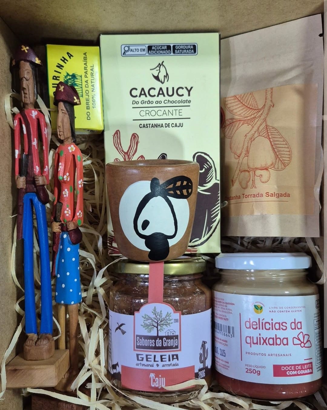 Doce de leite misto com goiaba, café ou coco, geleias artesanais com a fruta da época, castanhas,chocolate crocante com castanha, rapadurinha, e esse copo dose em barro natural com a pintura da xica do pote!!! Na nossa caixa em mdf linda de viver + cartão personalizado para presente.