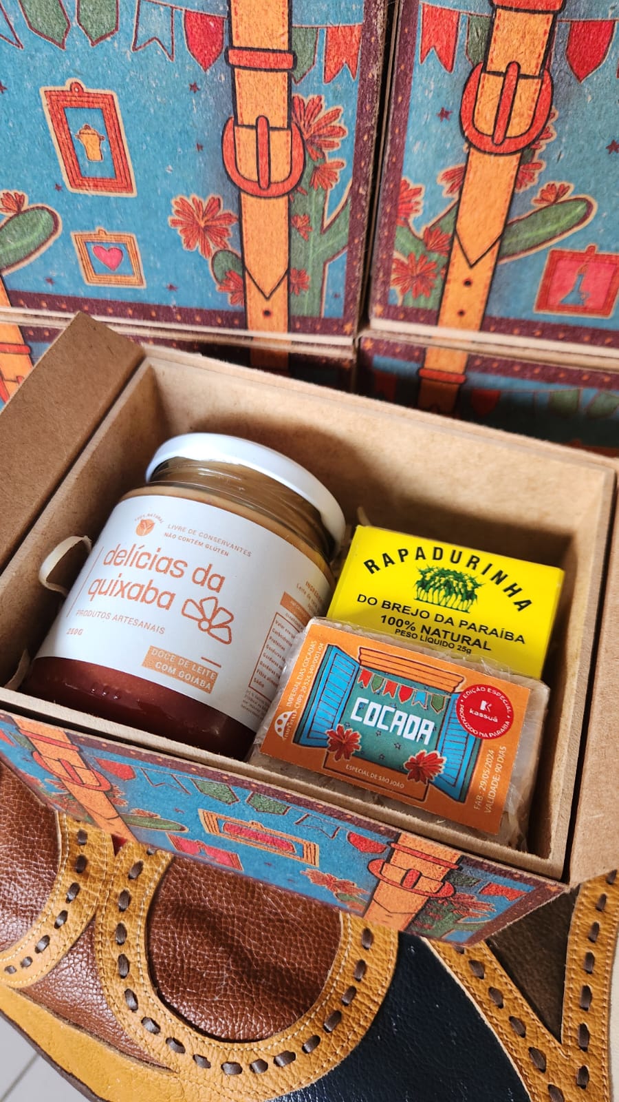 Caixa com base em madeira mdf natural e tampa em kraft com estampa armorial medindo 11 X 14cm com altura de 10cm, com delicias nordestinas dentro.